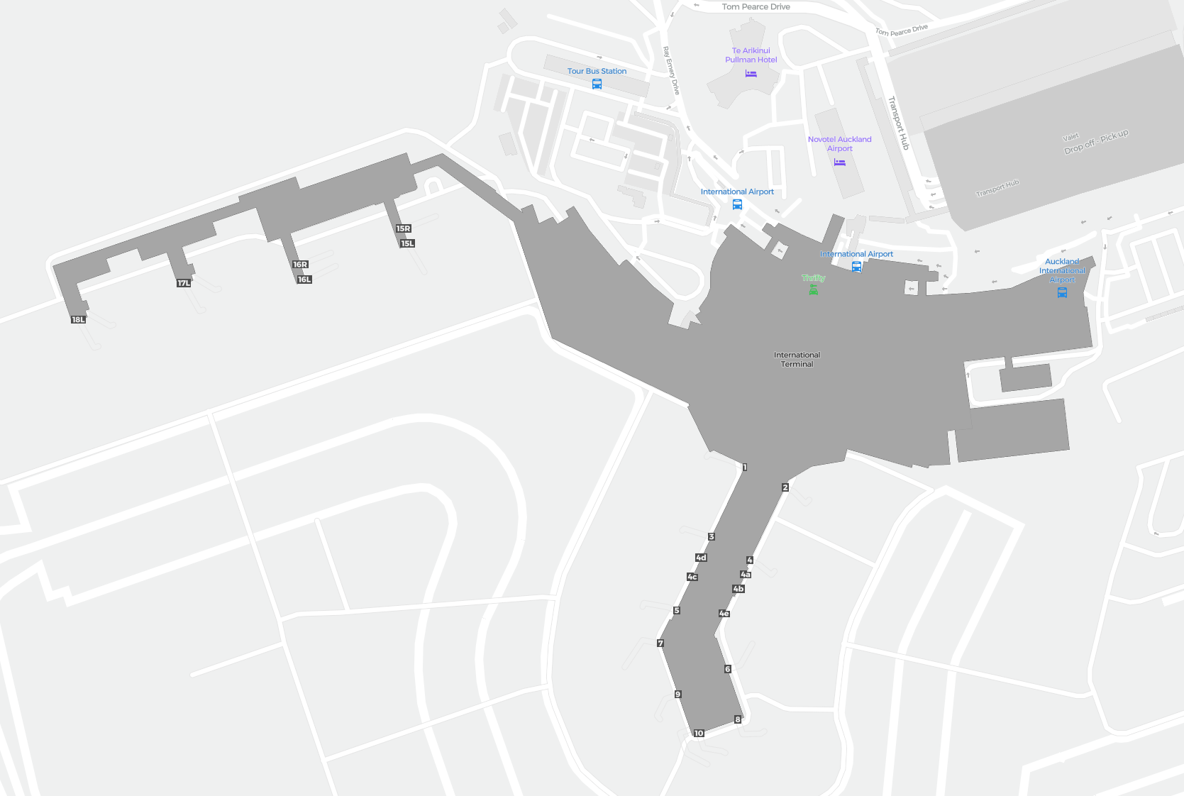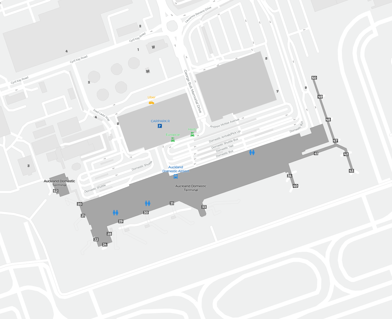 Dette er et zoombart kort over Auckland (AKL). Kortet giver dig et overblik over det udendørs område med terminaler, parkeringspladser, og på nogle lufthavne også detaljer om porte, biludlejningsfaciliteter og andre faciliteter, når du zoomer ind.