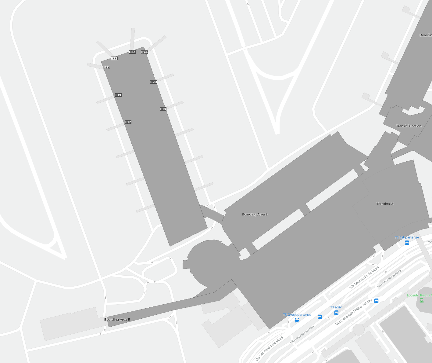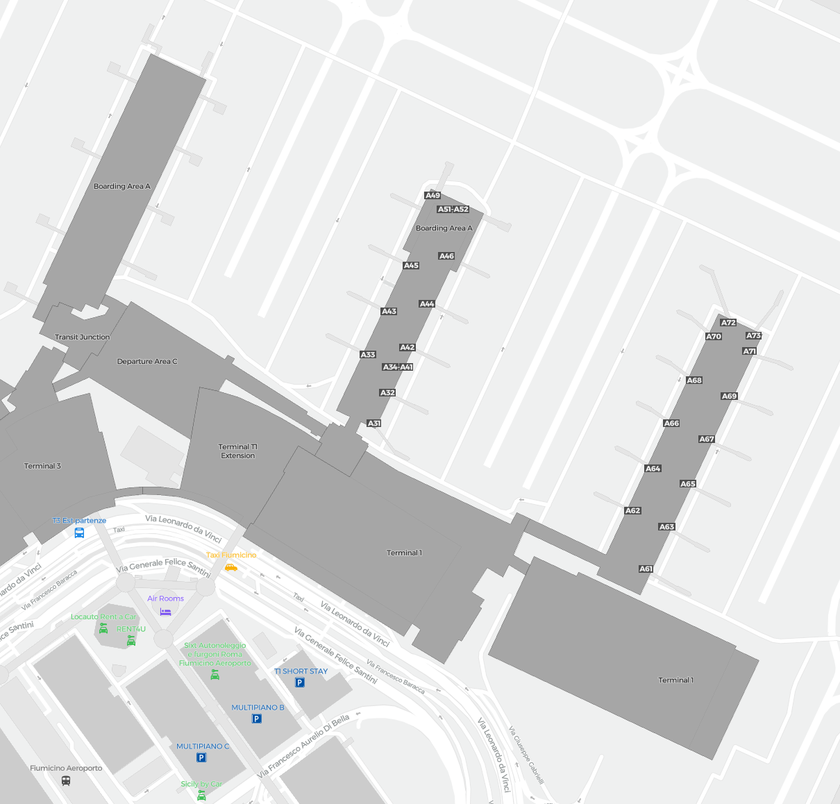 Dette er et zoombart kort over Rom (FCO). Kortet giver dig et overblik over det udendørs område med terminaler, parkeringspladser, og på nogle lufthavne også detaljer om porte, biludlejningsfaciliteter og andre faciliteter, når du zoomer ind.