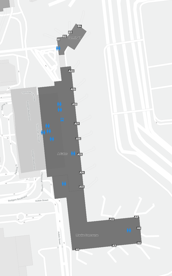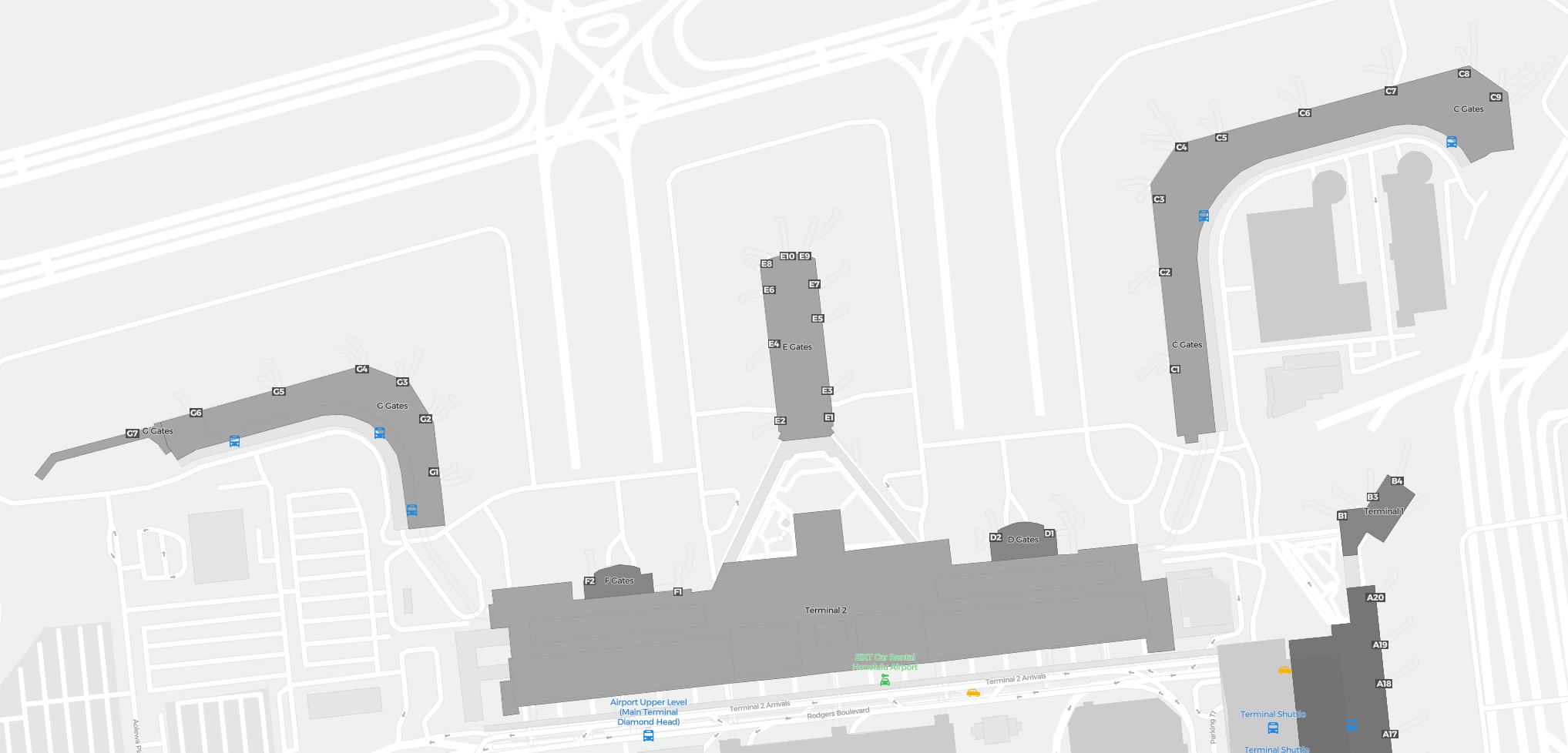Dette er et zoombart kort over Honolulu (HNL). Kortet giver dig et overblik over det udendørs område med terminaler, parkeringspladser, og på nogle lufthavne også detaljer om porte, biludlejningsfaciliteter og andre faciliteter, når du zoomer ind.