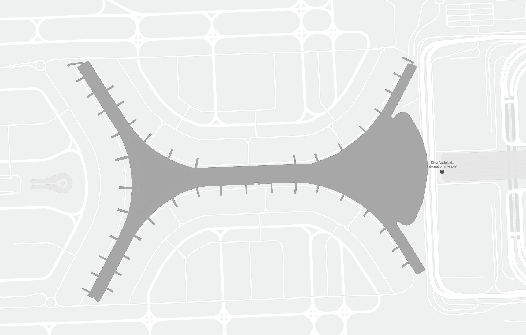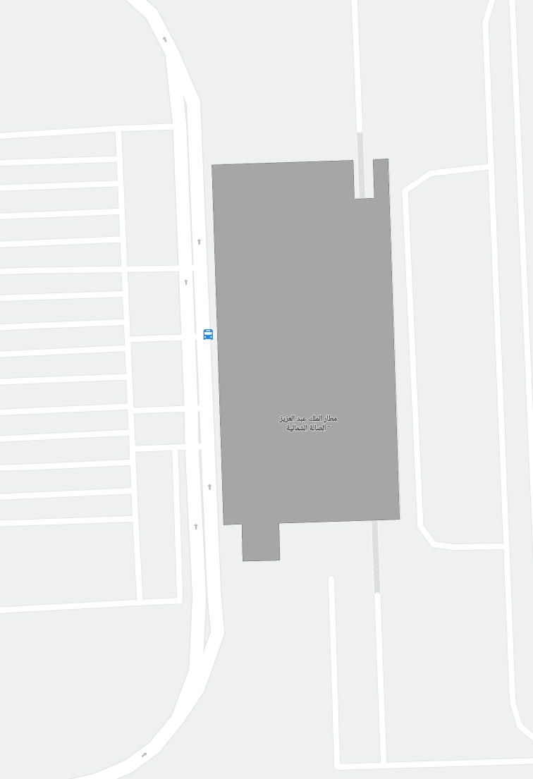Dette er et zoombart kort over Jeddah (JED). Kortet giver dig et overblik over det udendørs område med terminaler, parkeringspladser, og på nogle lufthavne også detaljer om porte, biludlejningsfaciliteter og andre faciliteter, når du zoomer ind.