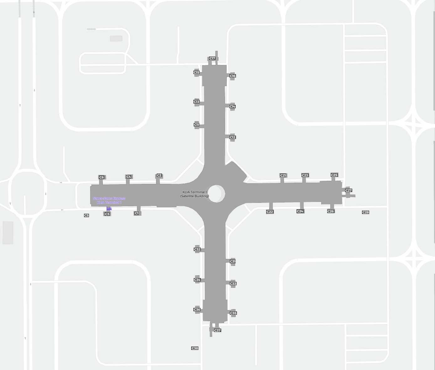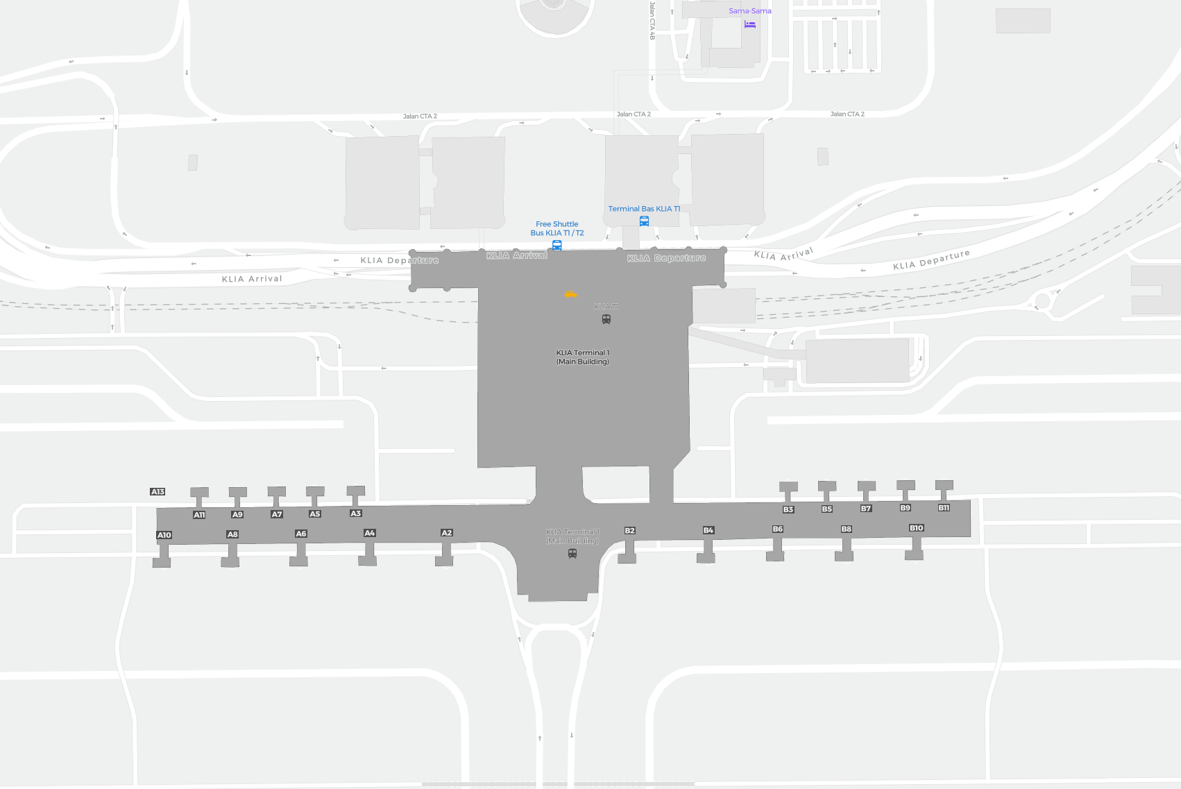 Dette er et zoombart kort over Kuala Lumpur (KUL). Kortet giver dig et overblik over det udendørs område med terminaler, parkeringspladser, og på nogle lufthavne også detaljer om porte, biludlejningsfaciliteter og andre faciliteter, når du zoomer ind.