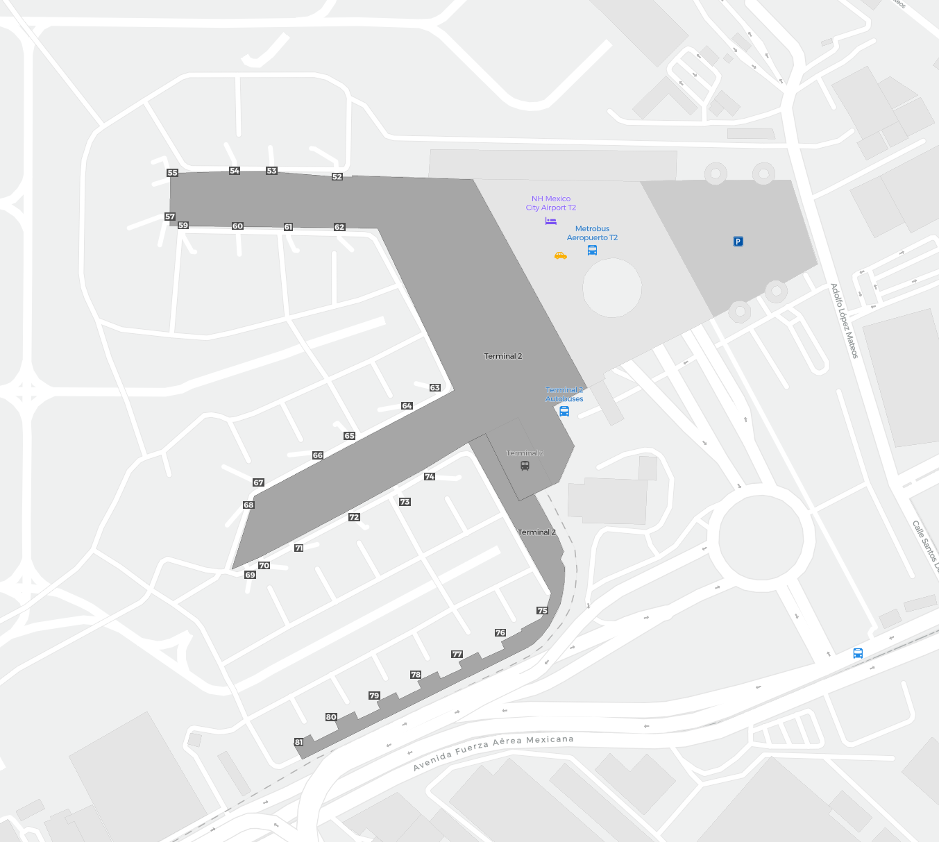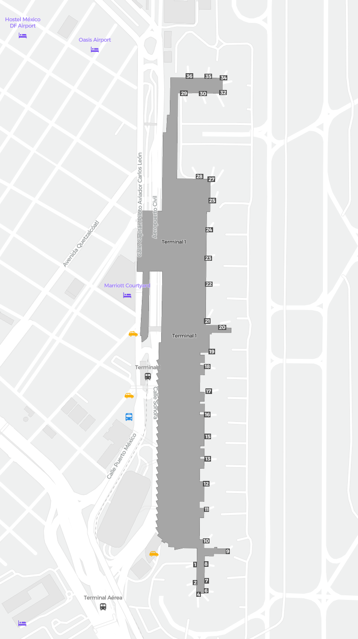 Dette er et zoombart kort over Mexico City City Federal District (MEX). Kortet giver dig et overblik over det udendørs område med terminaler, parkeringspladser, og på nogle lufthavne også detaljer om porte, biludlejningsfaciliteter og andre faciliteter, når du zoomer ind.