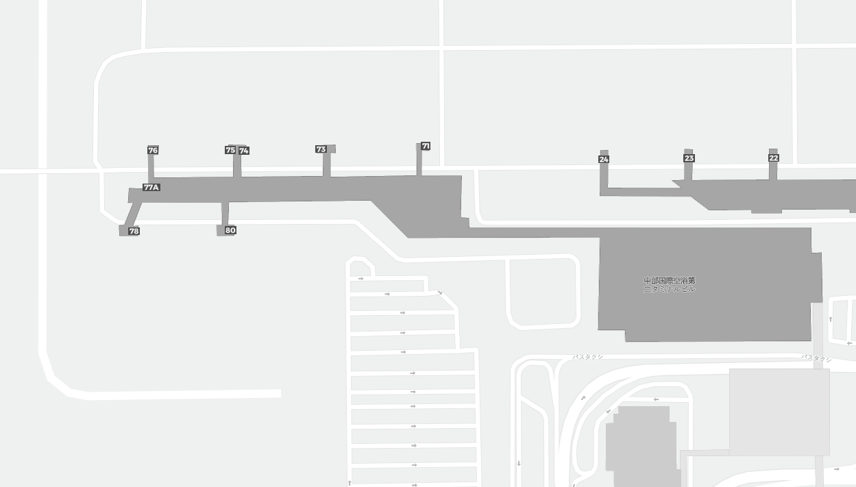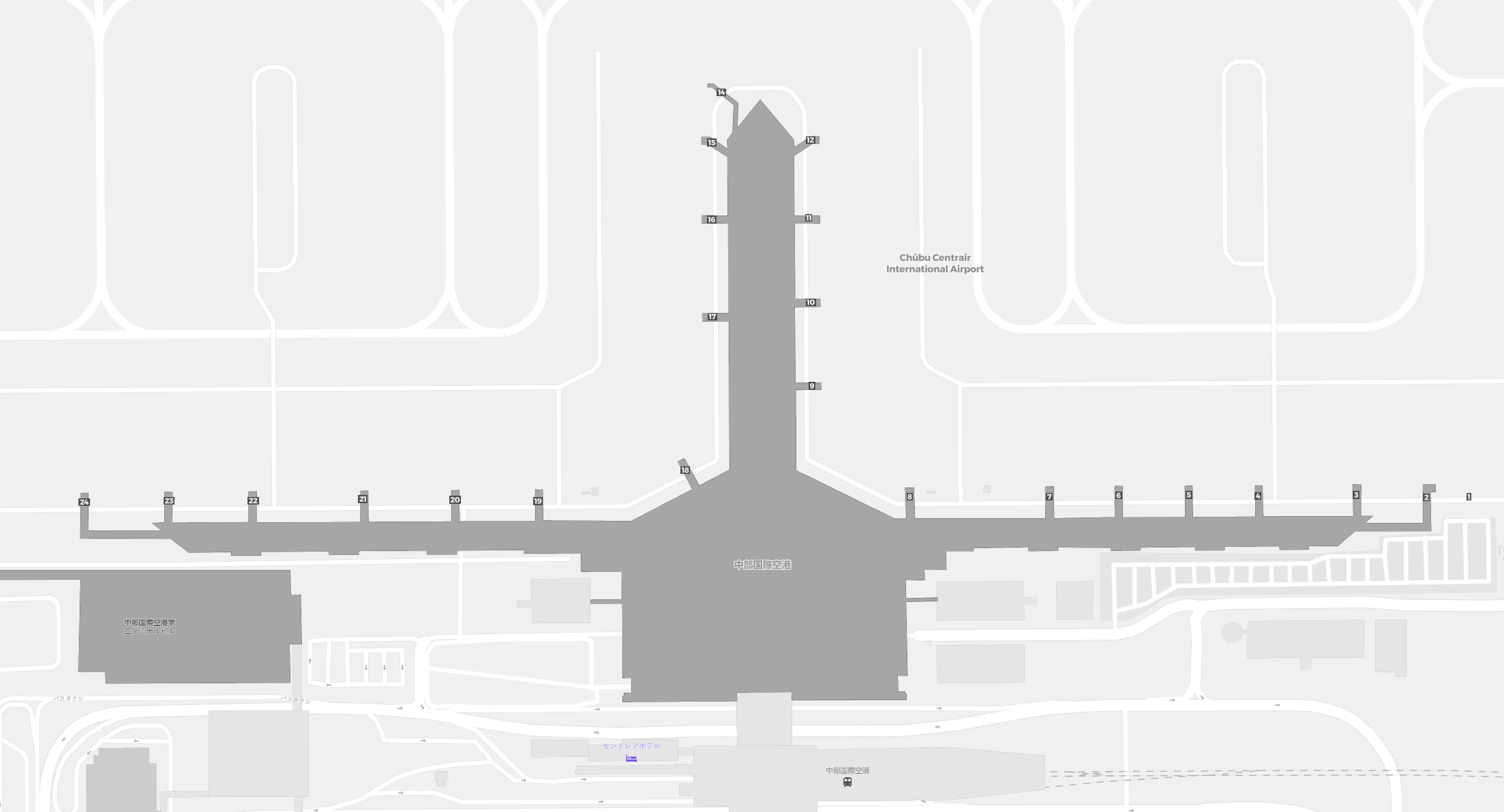 Dette er et zoombart kort over Nagoya (NGO). Kortet giver dig et overblik over det udendørs område med terminaler, parkeringspladser, og på nogle lufthavne også detaljer om porte, biludlejningsfaciliteter og andre faciliteter, når du zoomer ind.
