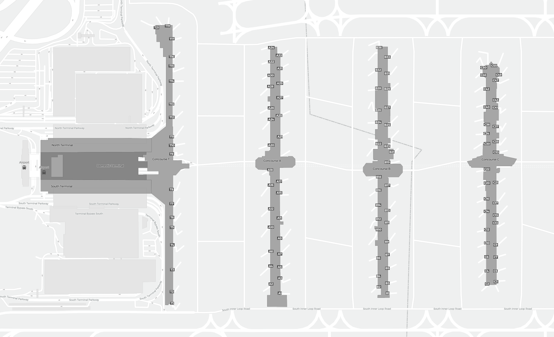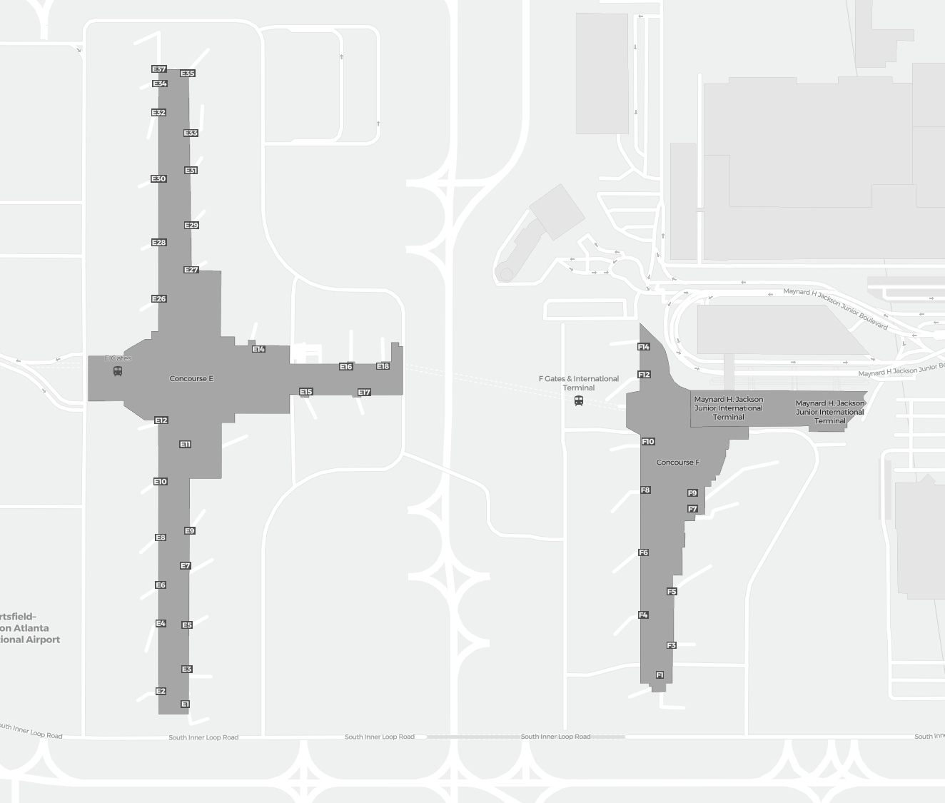 Dette er et zoombart kort over Atlanta (ATL). Kortet giver dig et overblik over det udendørs område med terminaler, parkeringspladser, og på nogle lufthavne også detaljer om porte, biludlejningsfaciliteter og andre faciliteter, når du zoomer ind.