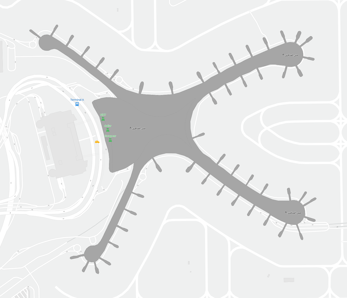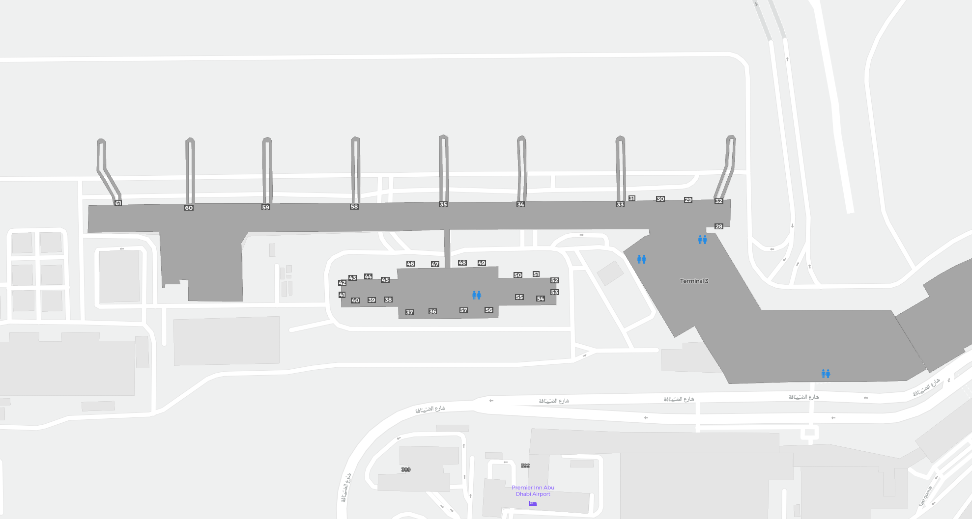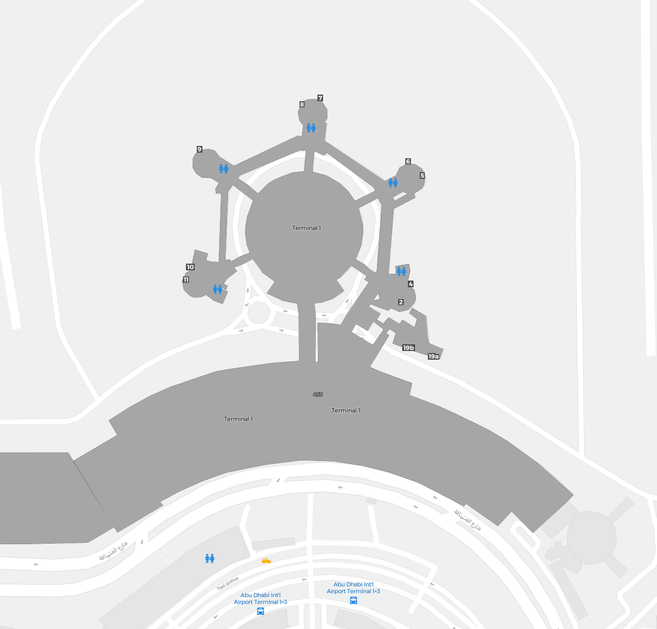 Dette er et zoombart kort over Abu Dhabi (AUH). Kortet giver dig et overblik over det udendørs område med terminaler, parkeringspladser, og på nogle lufthavne også detaljer om porte, biludlejningsfaciliteter og andre faciliteter, når du zoomer ind.