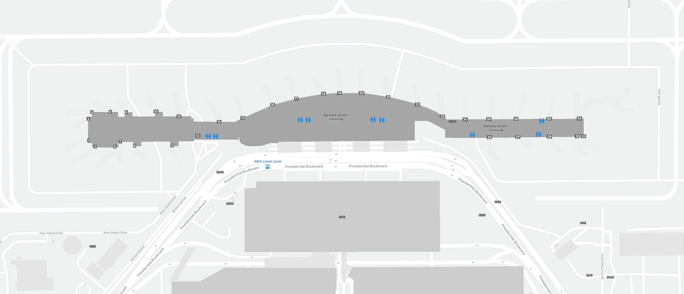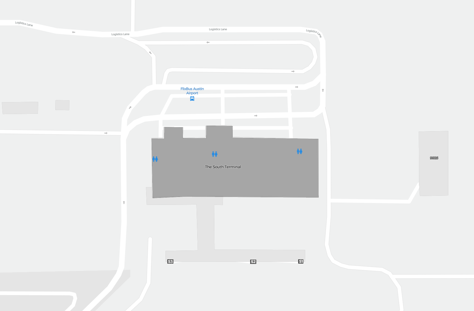 Dette er et zoombart kort over Austin (AUS). Kortet giver dig et overblik over det udendørs område med terminaler, parkeringspladser, og på nogle lufthavne også detaljer om porte, biludlejningsfaciliteter og andre faciliteter, når du zoomer ind.