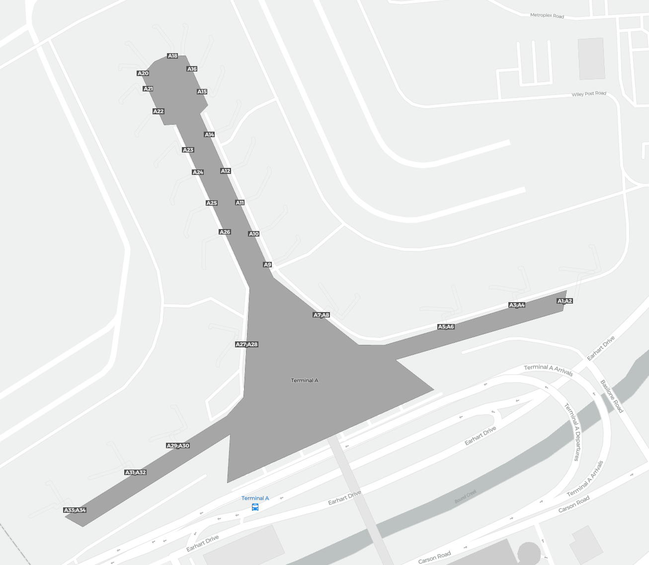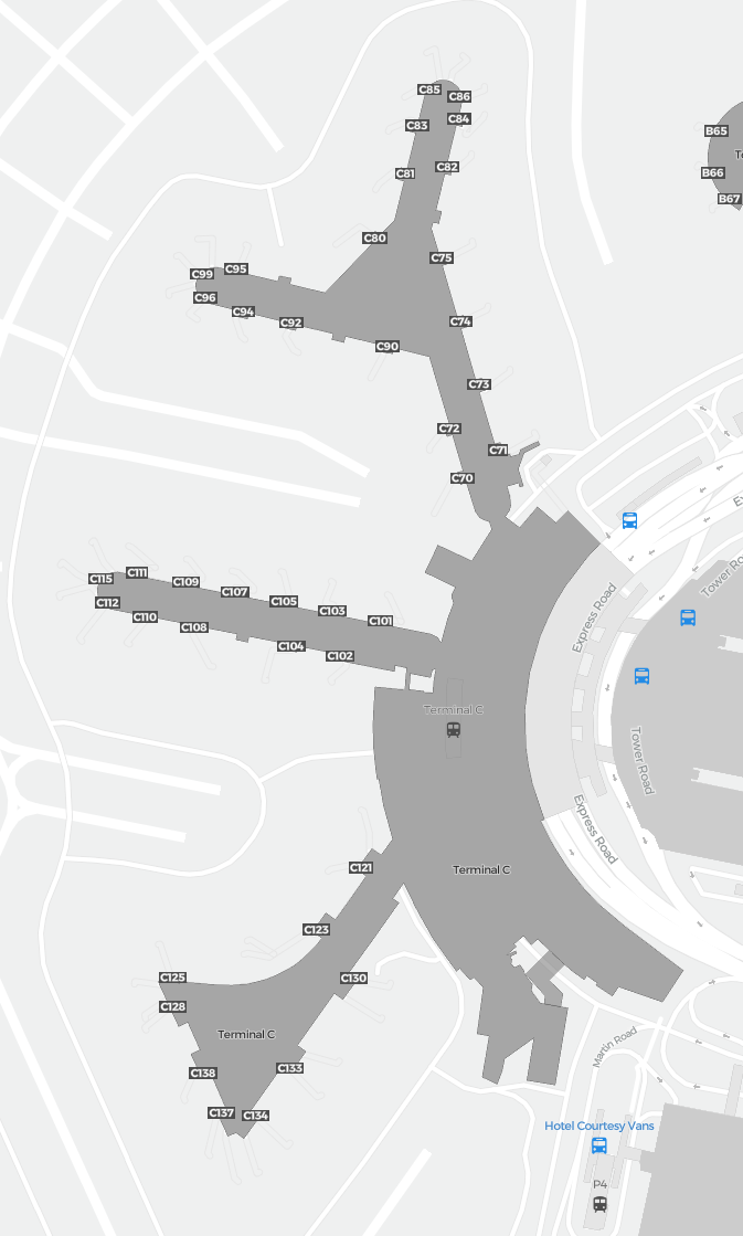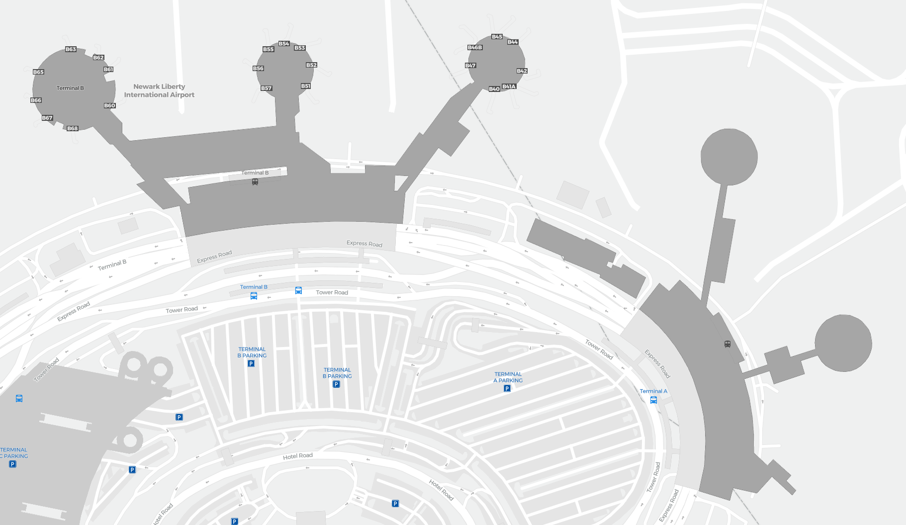 Dette er et zoombart kort over Newark (EWR). Kortet giver dig et overblik over det udendørs område med terminaler, parkeringspladser, og på nogle lufthavne også detaljer om porte, biludlejningsfaciliteter og andre faciliteter, når du zoomer ind.