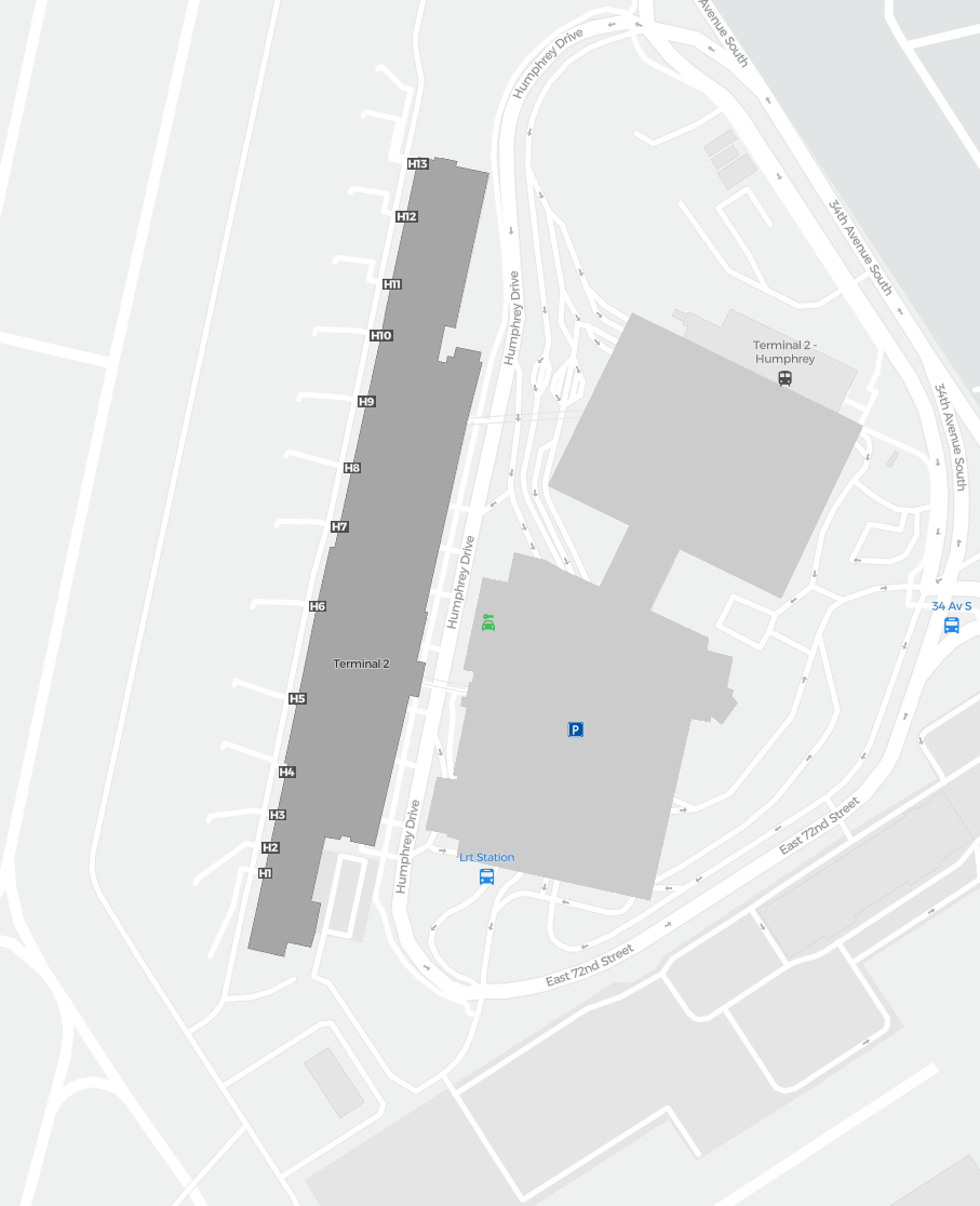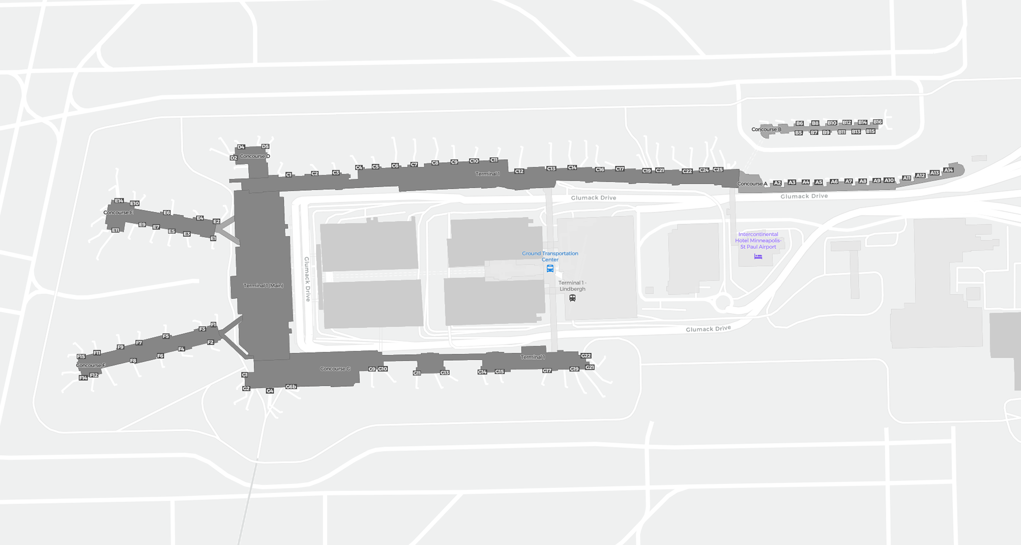 Dette er et zoombart kort over Minneapolis (MSP). Kortet giver dig et overblik over det udendørs område med terminaler, parkeringspladser, og på nogle lufthavne også detaljer om porte, biludlejningsfaciliteter og andre faciliteter, når du zoomer ind.