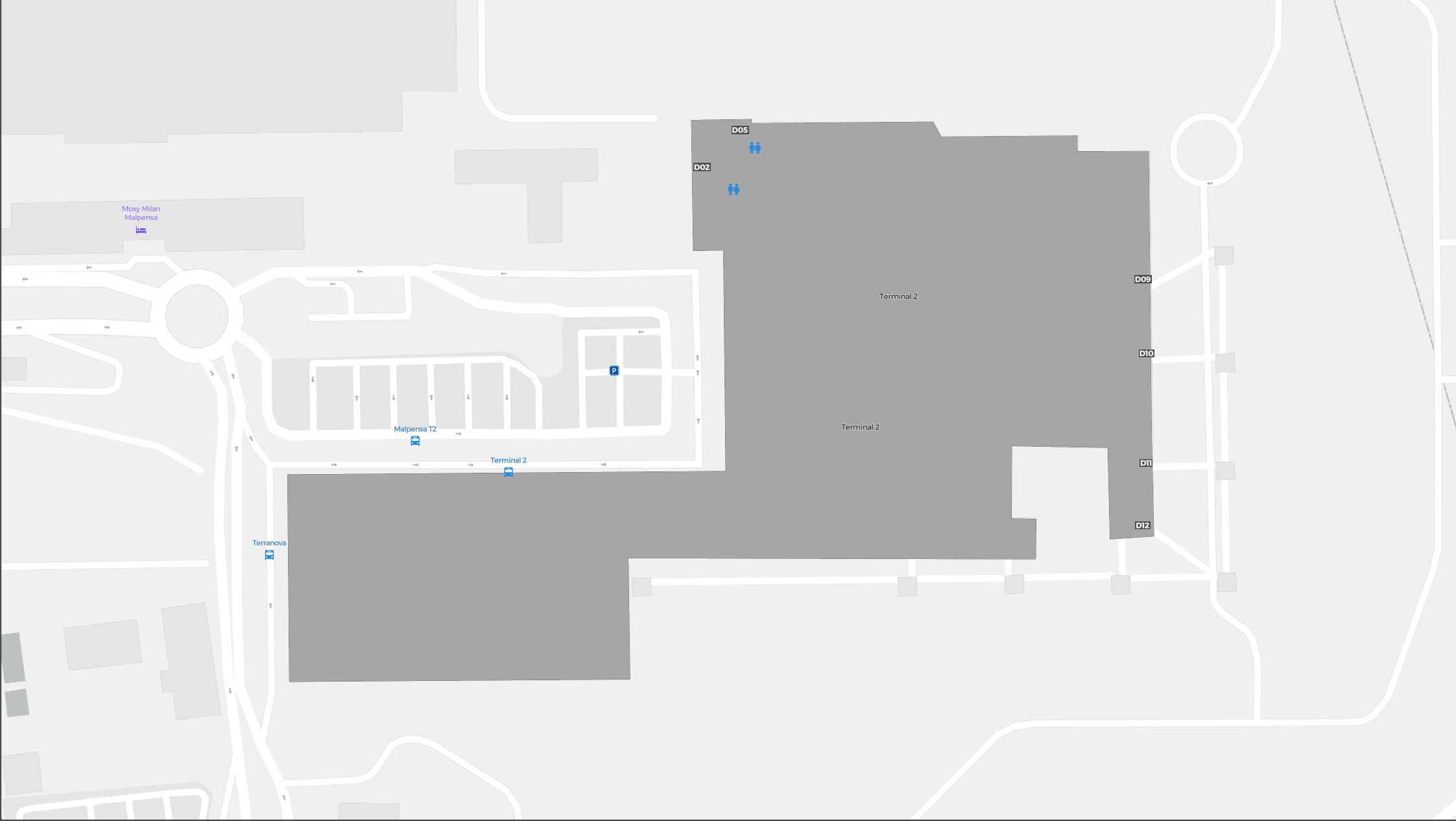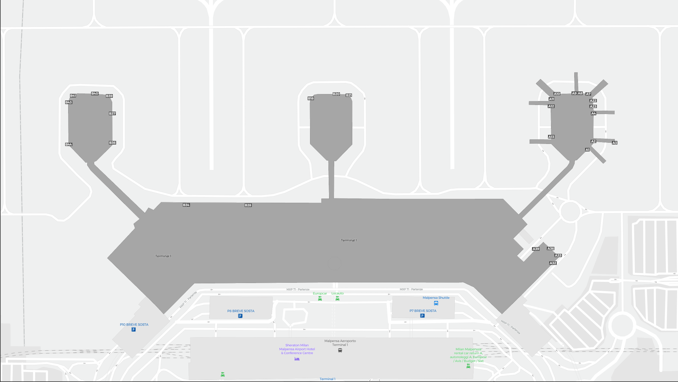 Dette er et zoombart kort over Milano (MXP). Kortet giver dig et overblik over det udendørs område med terminaler, parkeringspladser, og på nogle lufthavne også detaljer om porte, biludlejningsfaciliteter og andre faciliteter, når du zoomer ind.