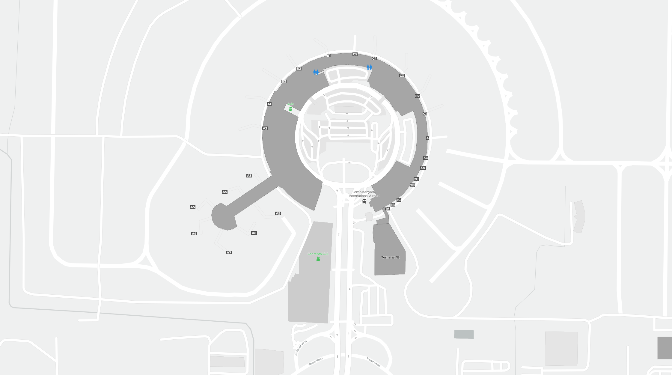Dette er et zoombart kort over Nairobi (NBO). Kortet giver dig et overblik over det udendørs område med terminaler, parkeringspladser, og på nogle lufthavne også detaljer om porte, biludlejningsfaciliteter og andre faciliteter, når du zoomer ind.