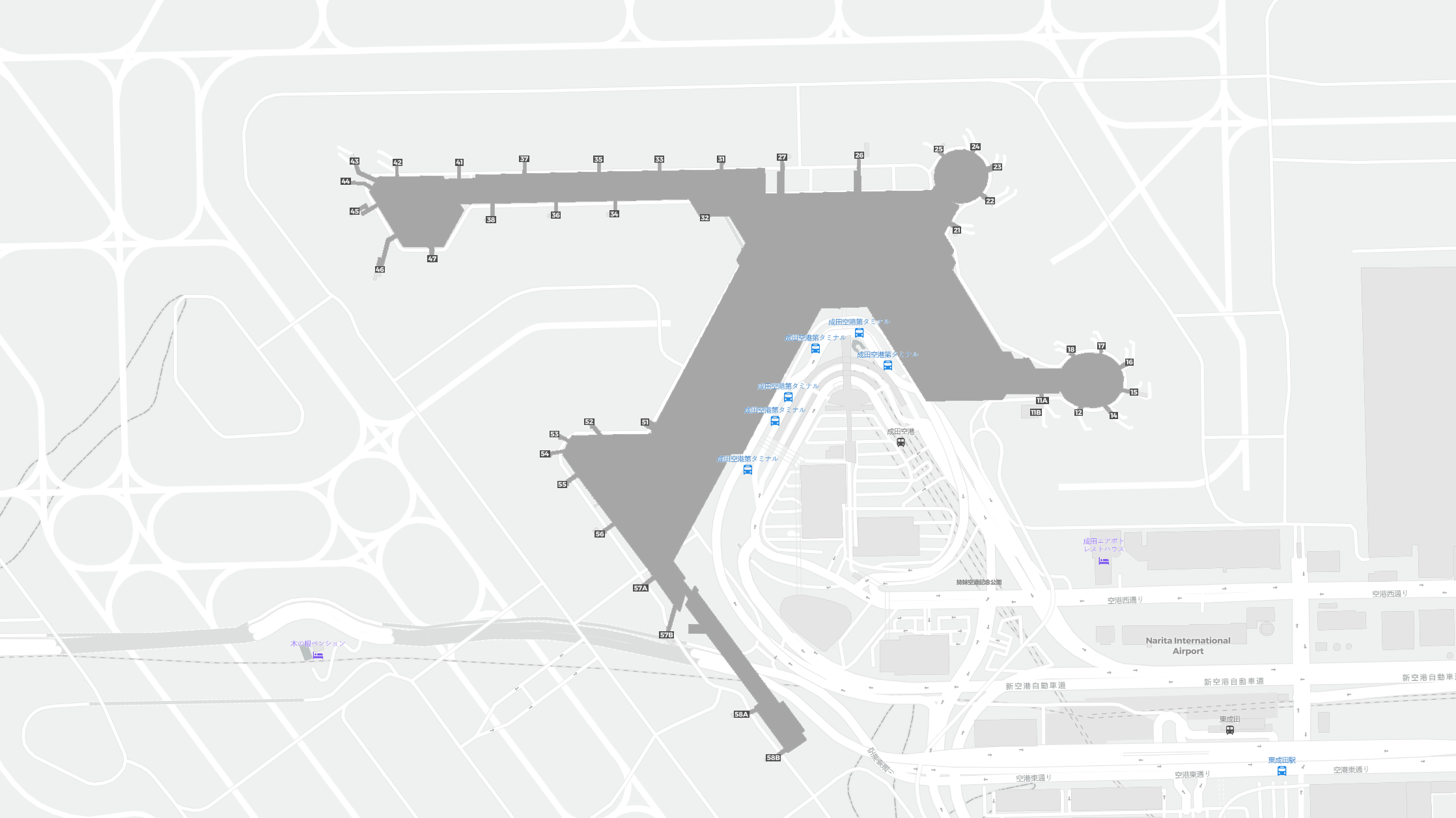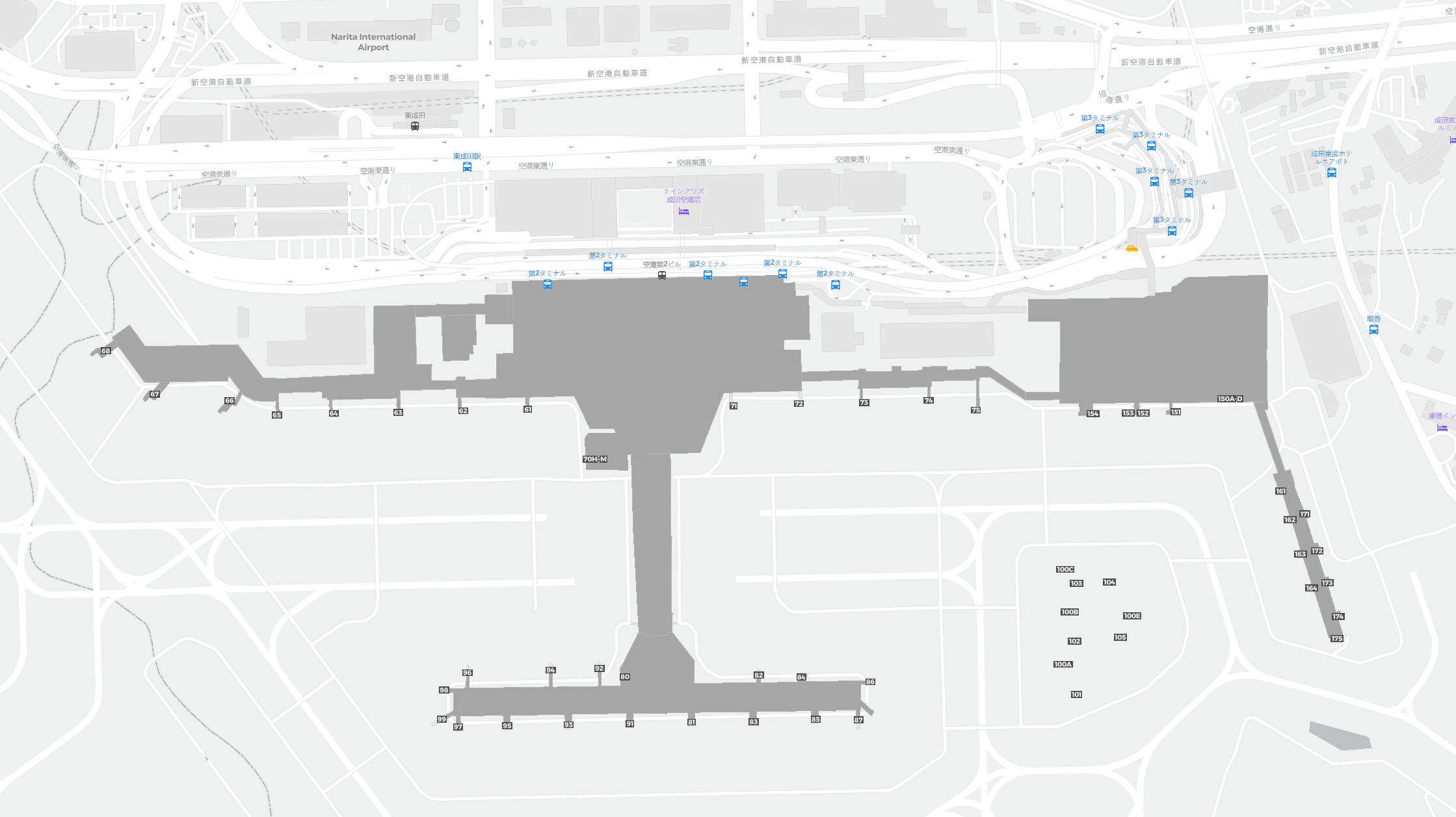 Dette er et zoombart kort over Tokyo (NRT). Kortet giver dig et overblik over det udendørs område med terminaler, parkeringspladser, og på nogle lufthavne også detaljer om porte, biludlejningsfaciliteter og andre faciliteter, når du zoomer ind.