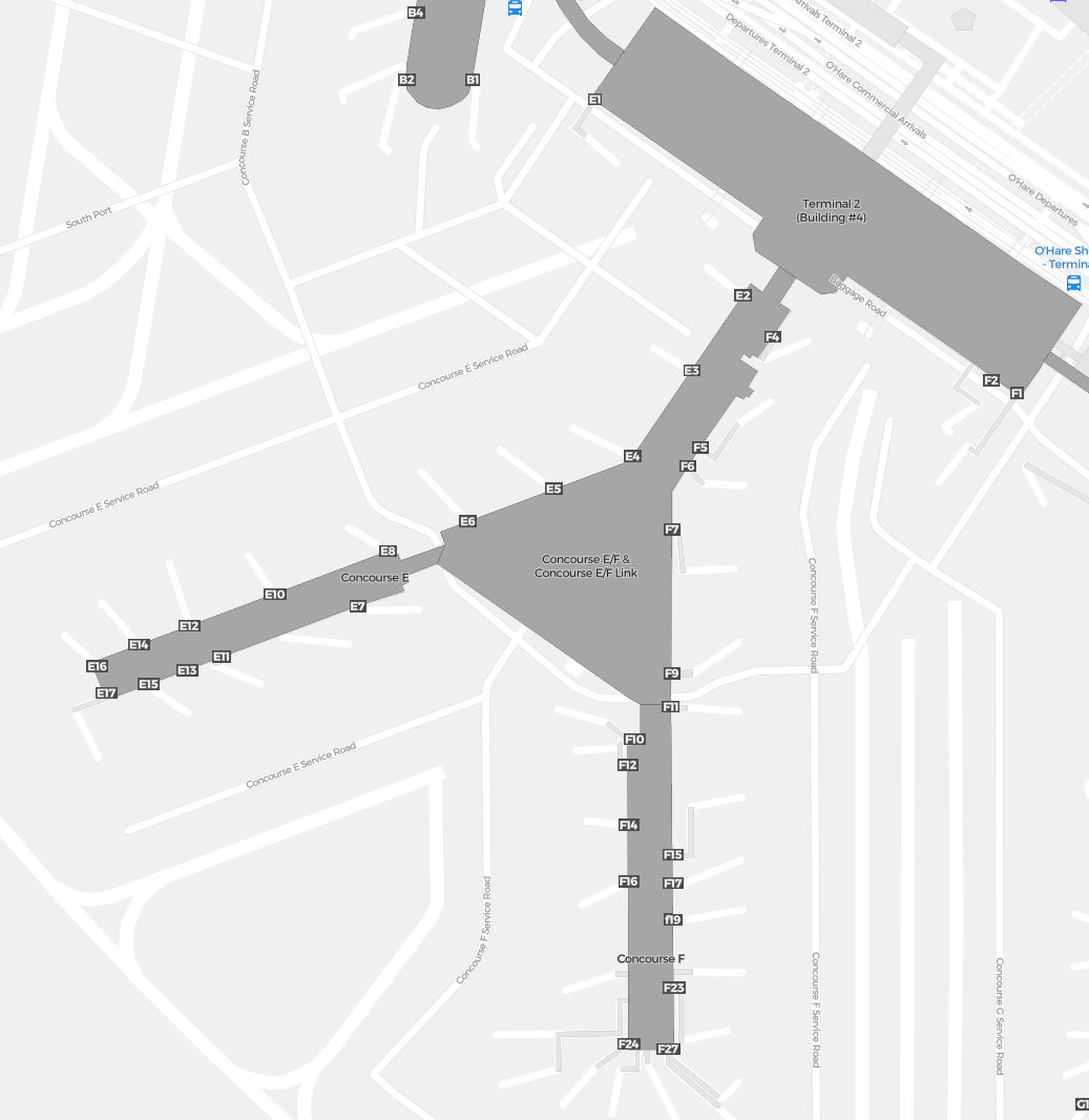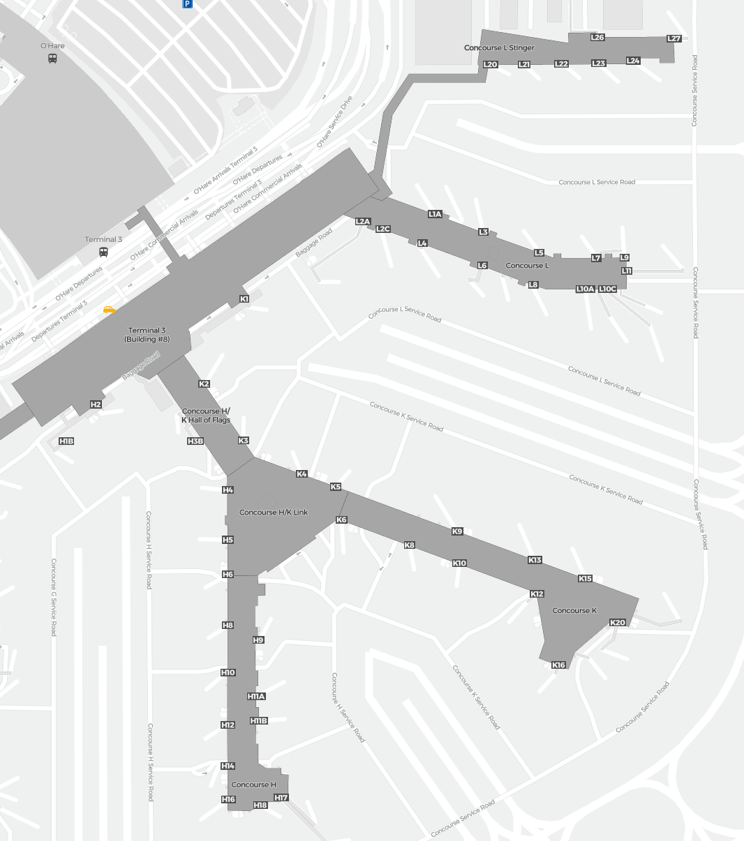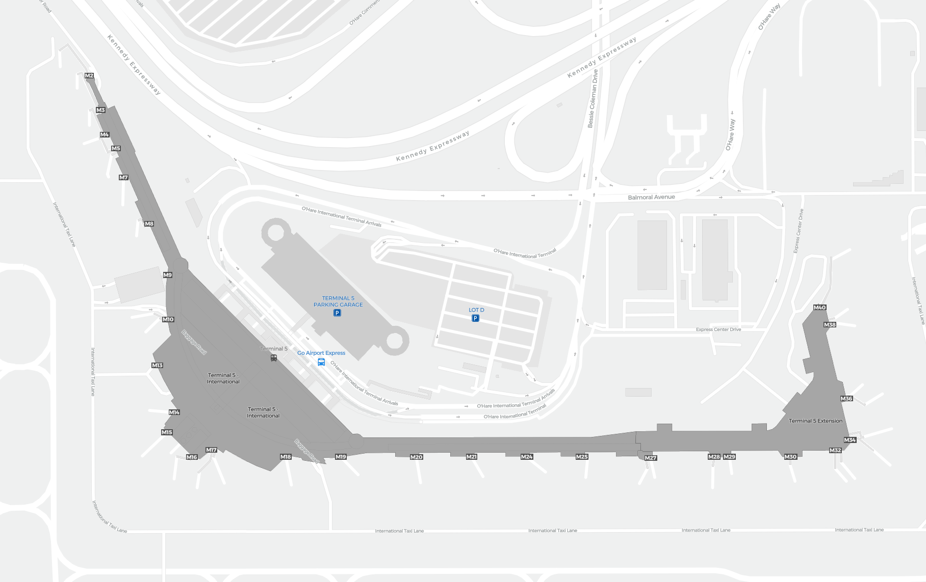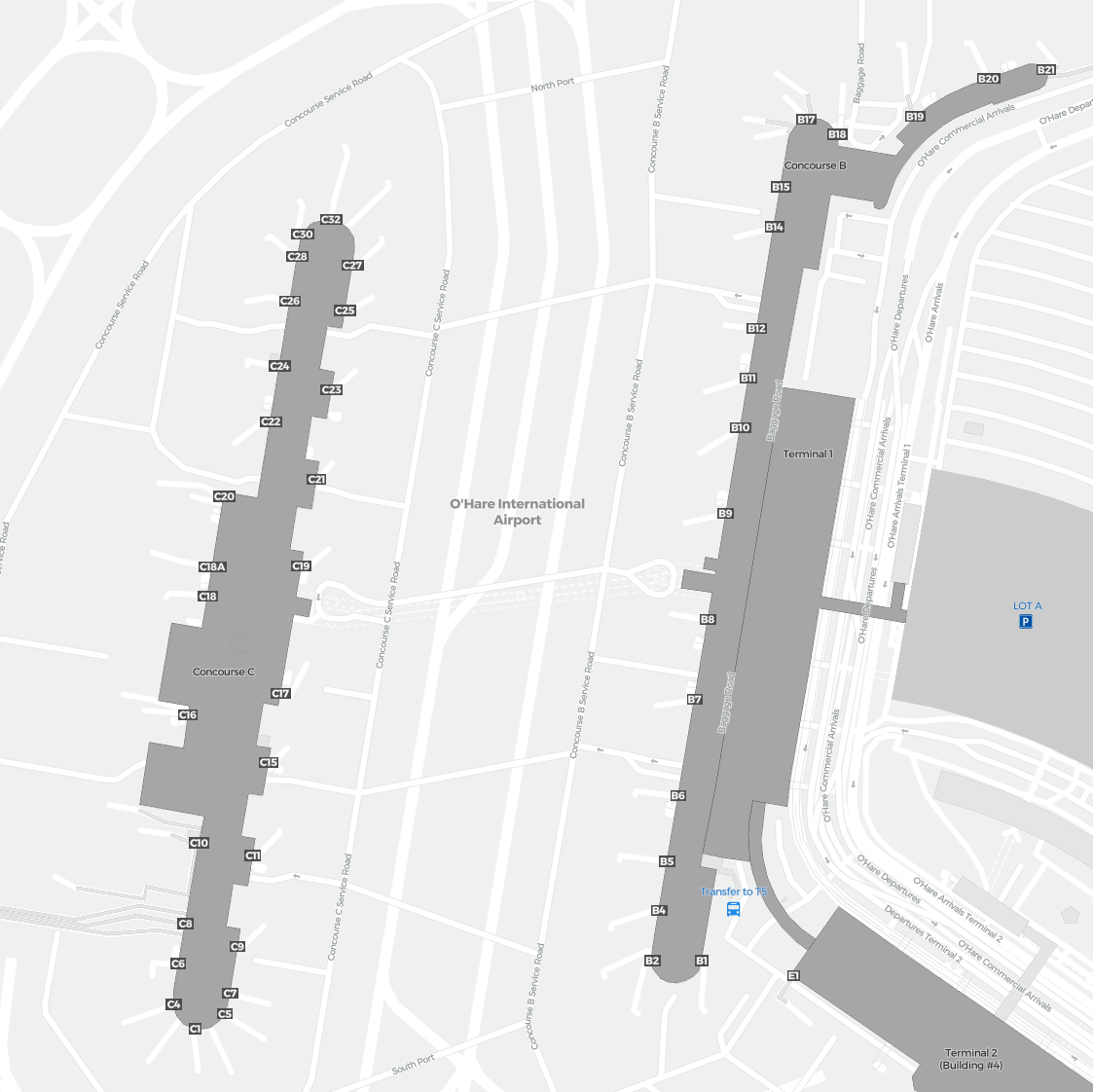 Dette er et zoombart kort over Chicago (ORD). Kortet giver dig et overblik over det udendørs område med terminaler, parkeringspladser, og på nogle lufthavne også detaljer om porte, biludlejningsfaciliteter og andre faciliteter, når du zoomer ind.