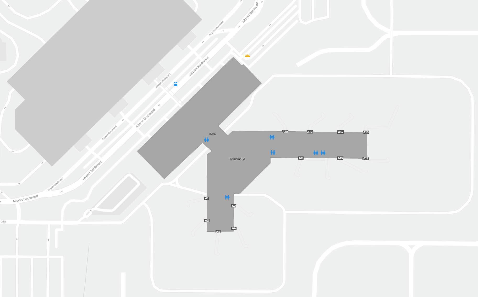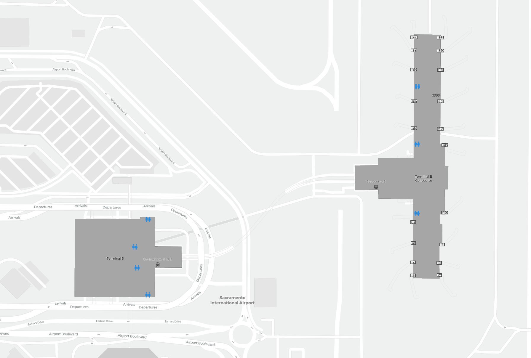Dette er et zoombart kort over Sacramento (SMF). Kortet giver dig et overblik over det udendørs område med terminaler, parkeringspladser, og på nogle lufthavne også detaljer om porte, biludlejningsfaciliteter og andre faciliteter, når du zoomer ind.