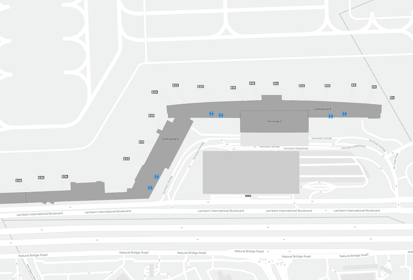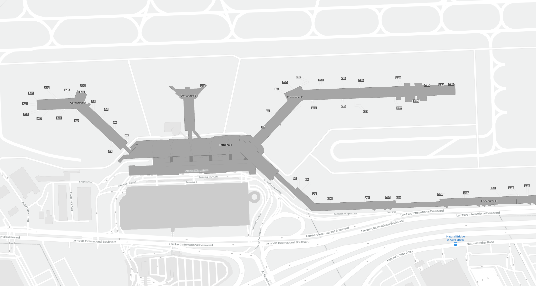 Dette er et zoombart kort over St. Louis (STL). Kortet giver dig et overblik over det udendørs område med terminaler, parkeringspladser, og på nogle lufthavne også detaljer om porte, biludlejningsfaciliteter og andre faciliteter, når du zoomer ind.