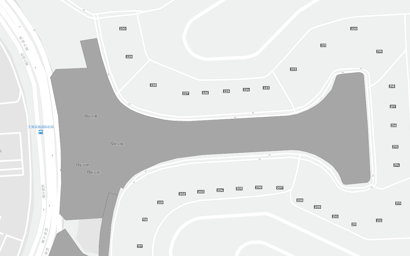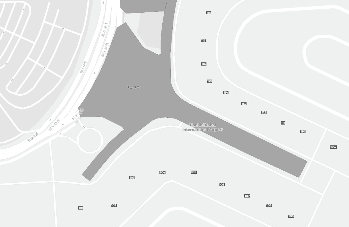Dette er et zoombart kort over Tianjin (TSN). Kortet giver dig et overblik over det udendørs område med terminaler, parkeringspladser, og på nogle lufthavne også detaljer om porte, biludlejningsfaciliteter og andre faciliteter, når du zoomer ind.